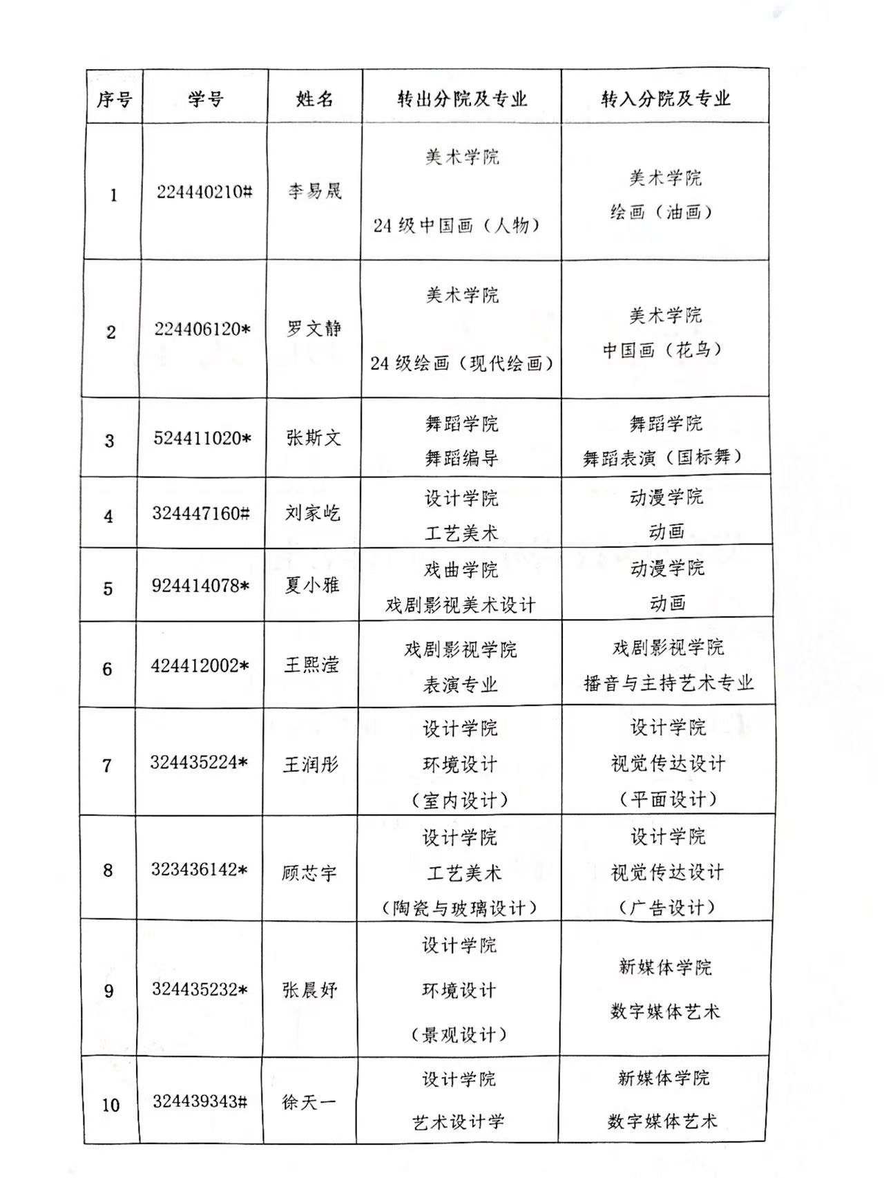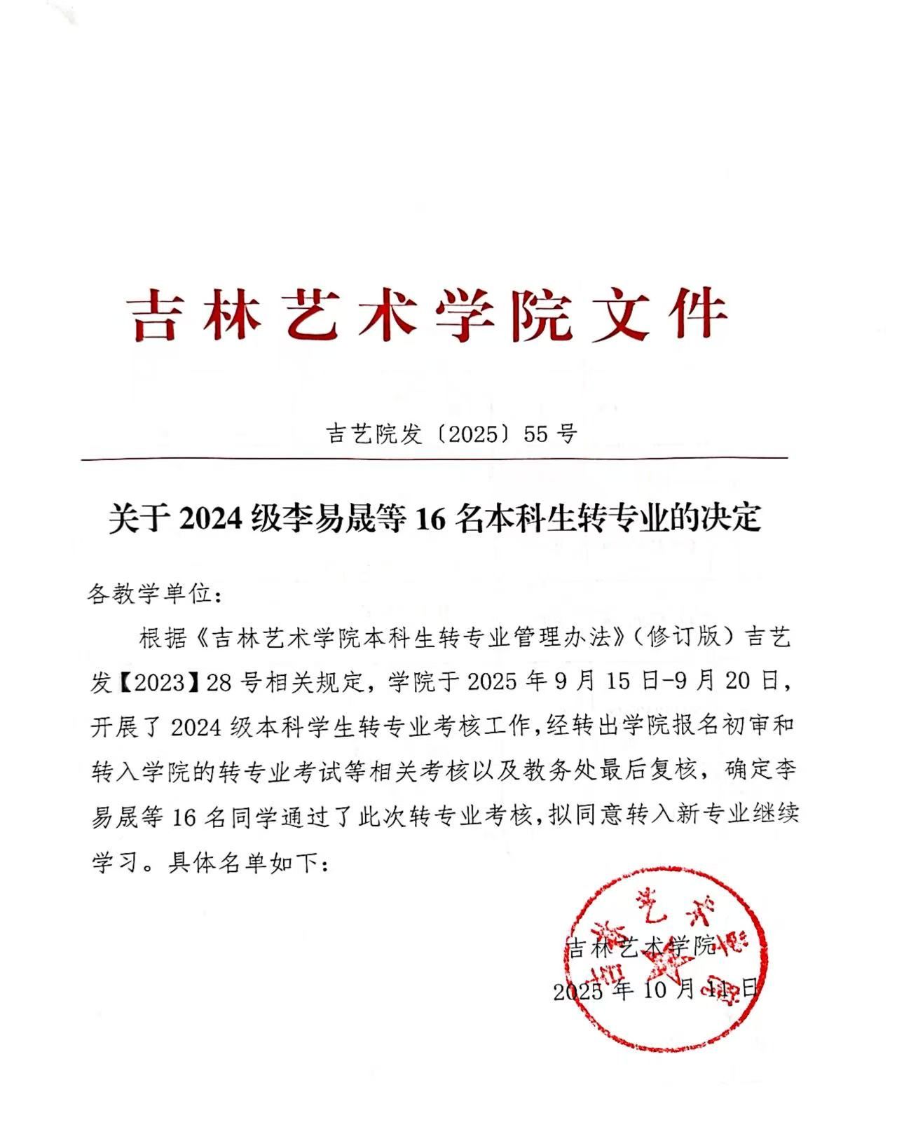 关于2024级李易晟等16名本科生转专业的决定